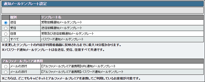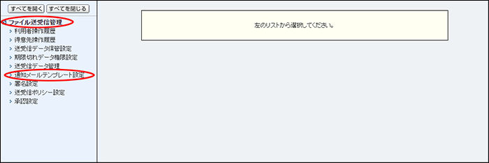 step1 ファイル送受信管理画面を表示し、「ファイル送受信管理」→「通知メールテンプレート設定」の順にクリックします。